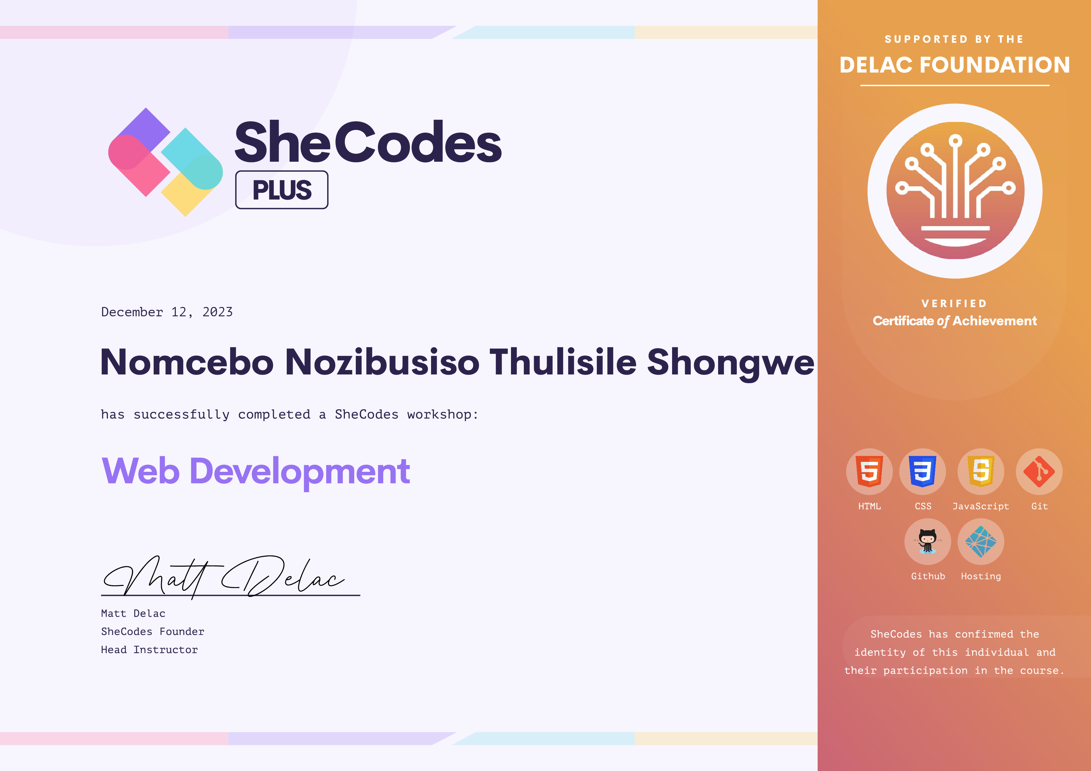 Nomcebo Nozibusiso Thulisile has been fully supported by the Delac Foundation to complete this SheCodes Workshop