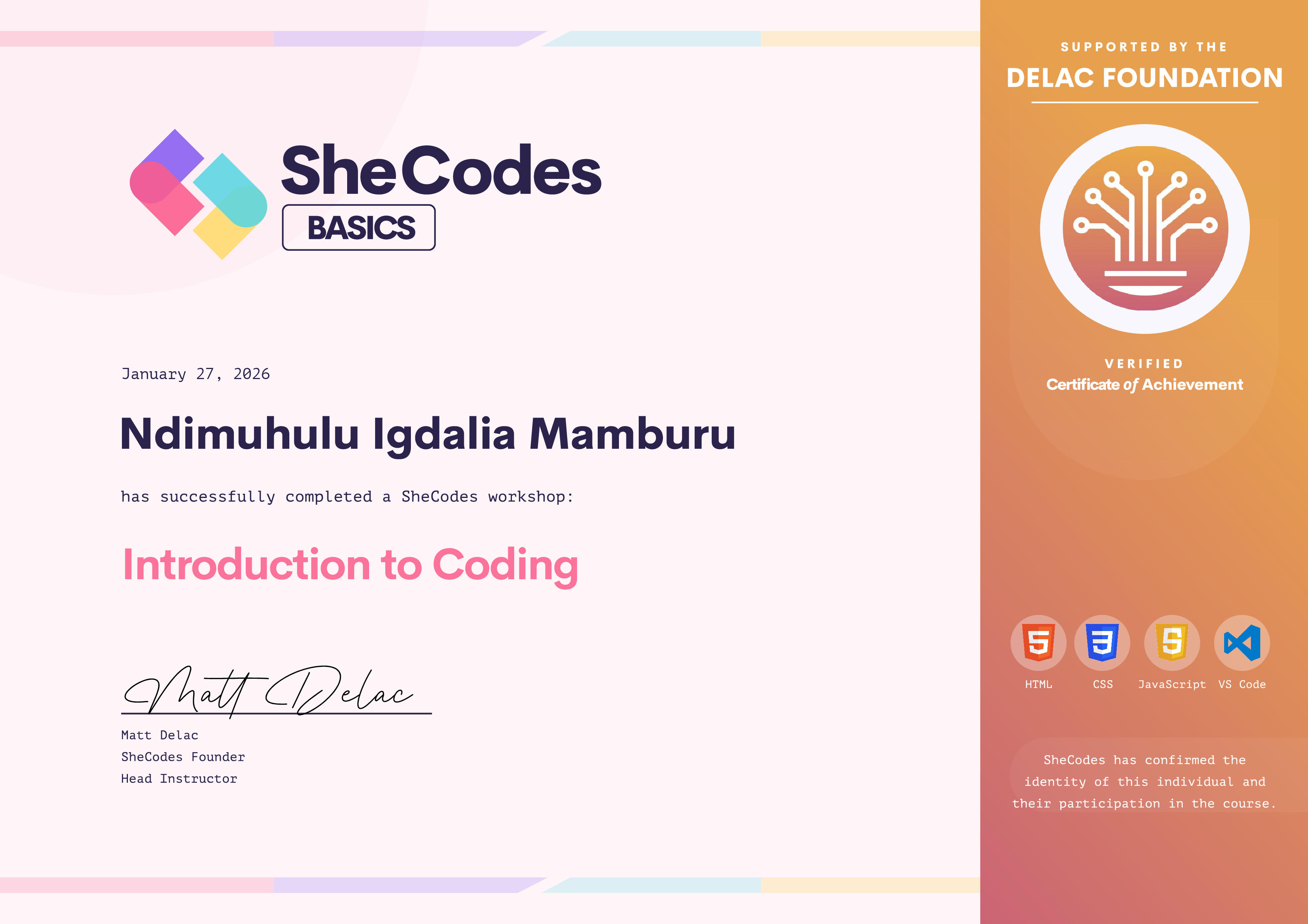 Ndimuhulu Igdalia has been fully supported by the Delac Foundation to complete this SheCodes Workshop