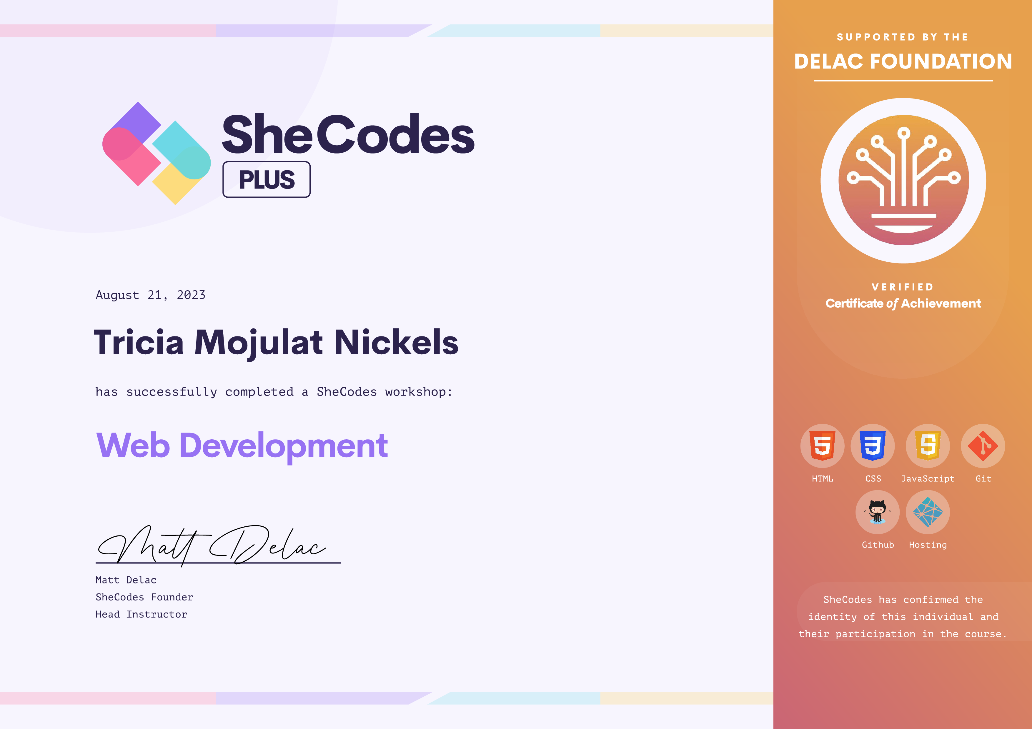 Tricia has been fully supported by the Delac Foundation to complete this SheCodes Workshop