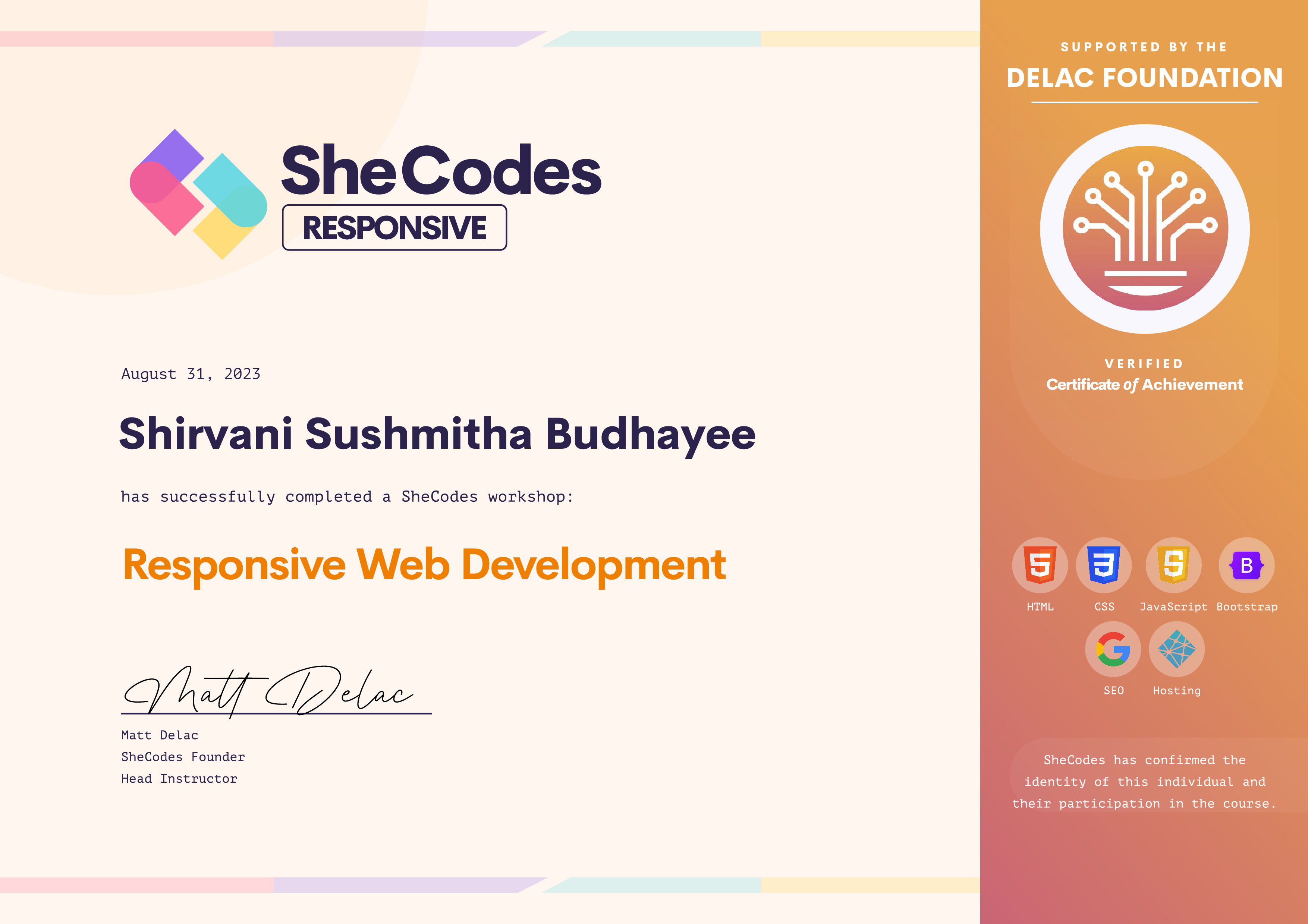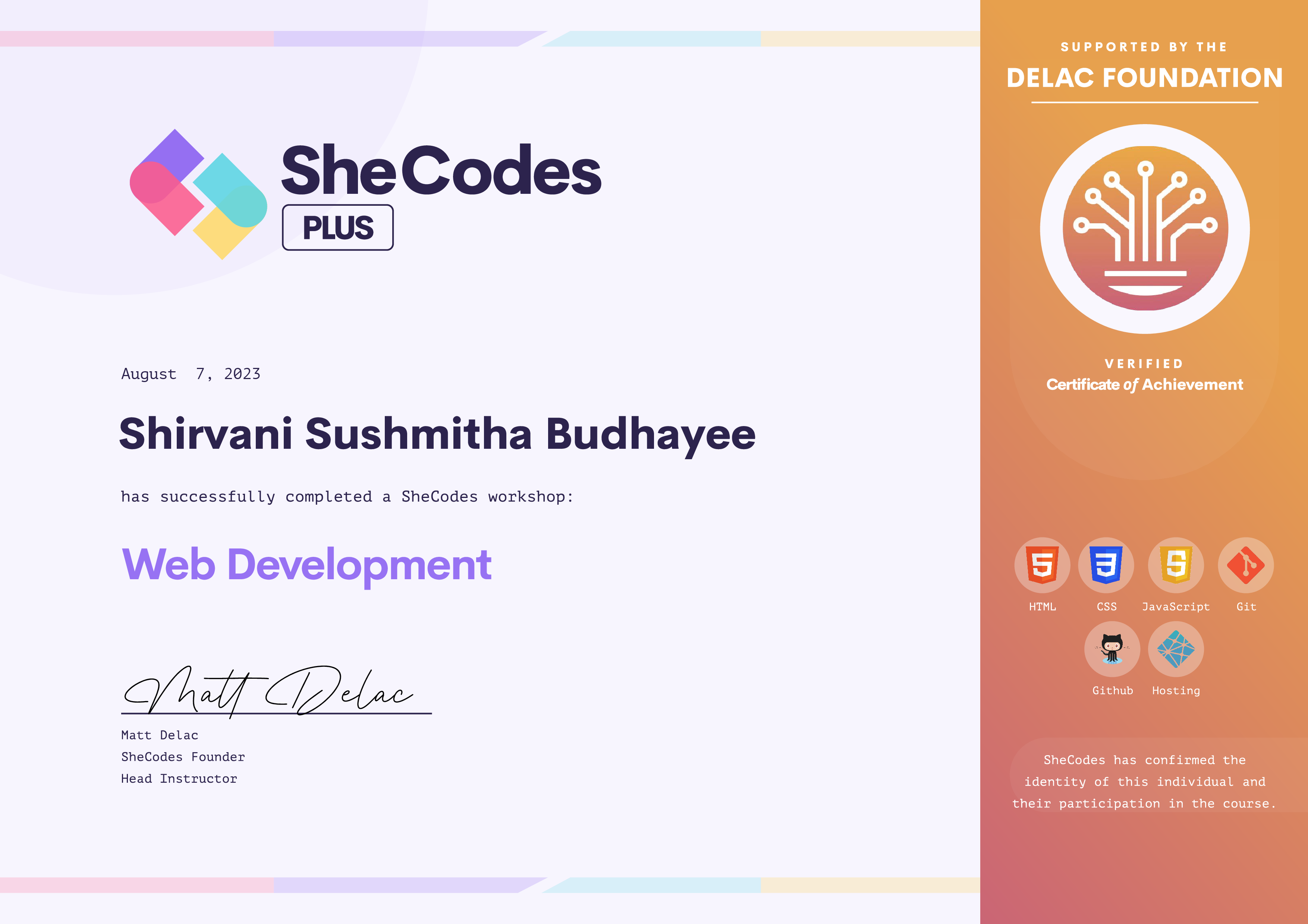 Shirvani Sushmitha has been fully supported by the Delac Foundation to complete this SheCodes Workshop