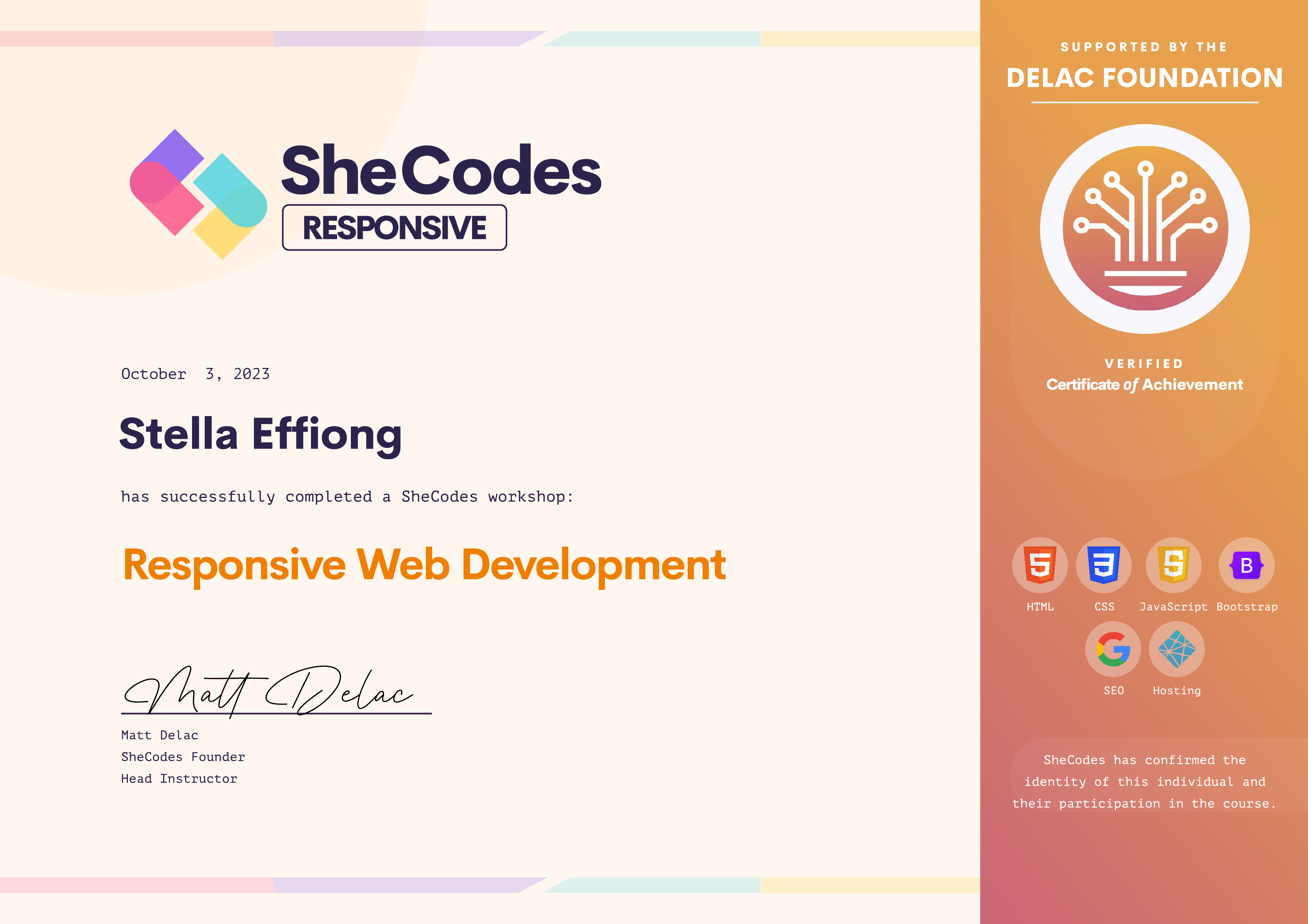 Stella has been fully supported by the Delac Foundation to complete this SheCodes Workshop