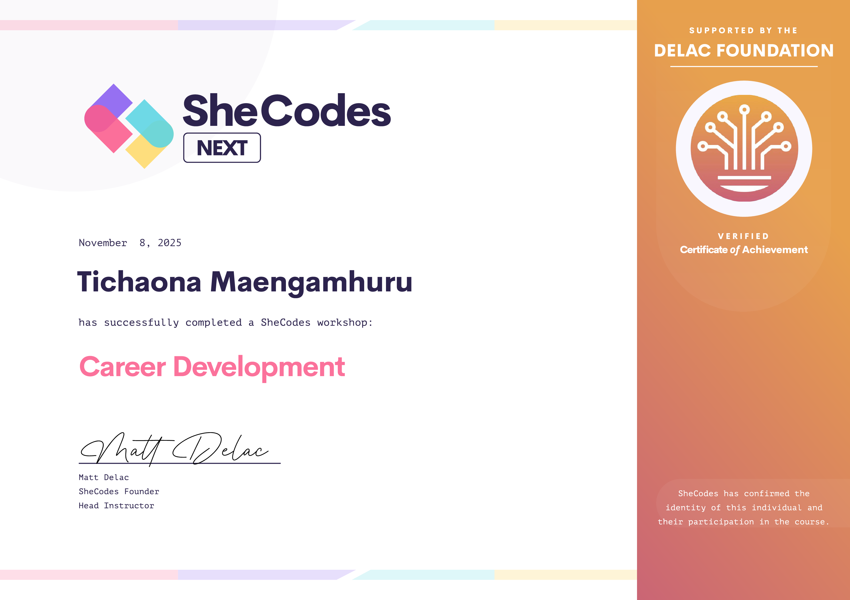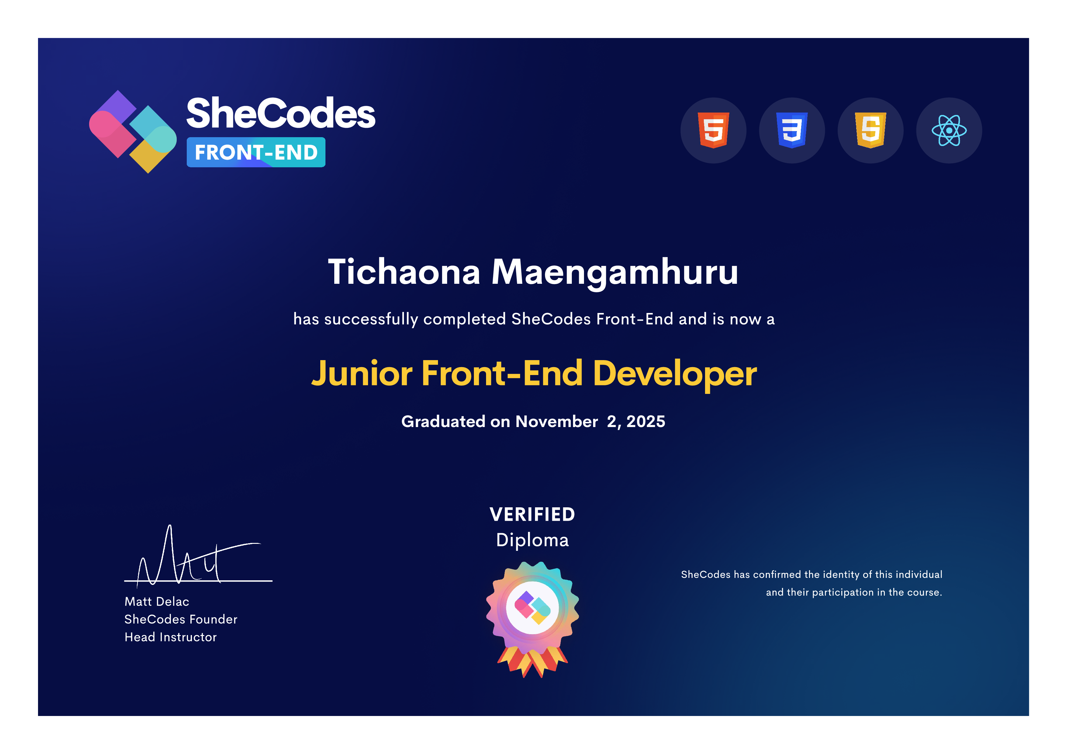 Tichaona Maengamhuru SheCodes Profile | SheCodes