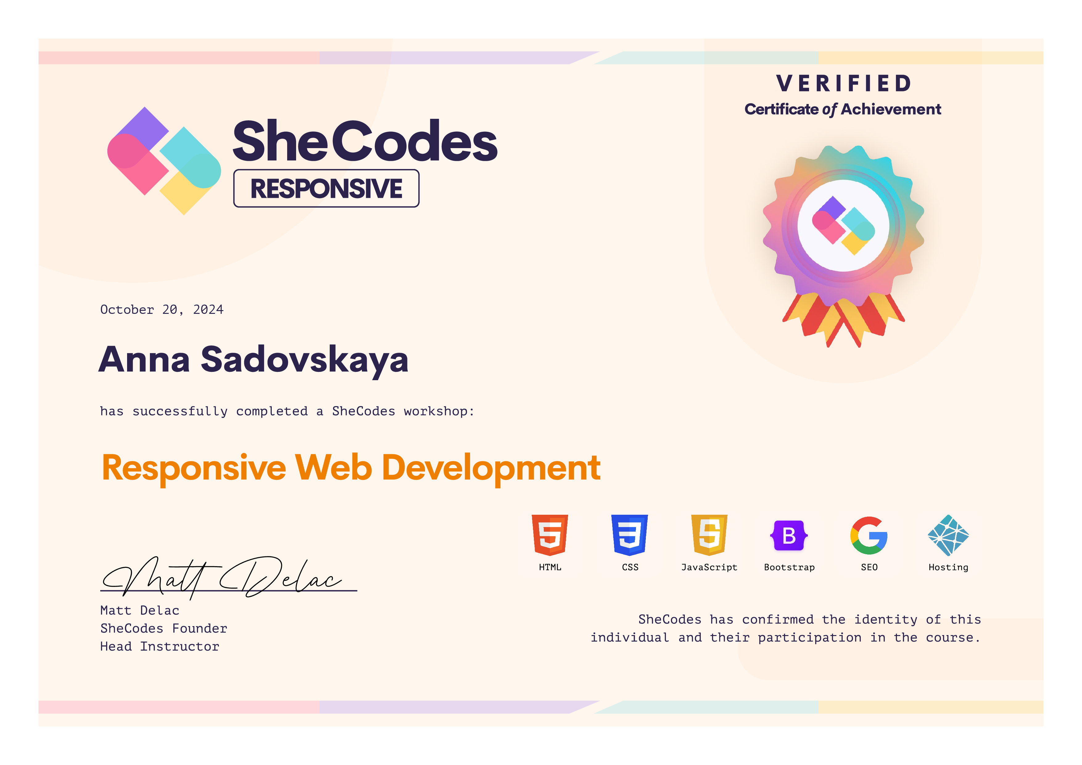 Anna successfully graduated from at least one SheCodes Coding Workshop and is featured in the SheCodes Hall of Fame