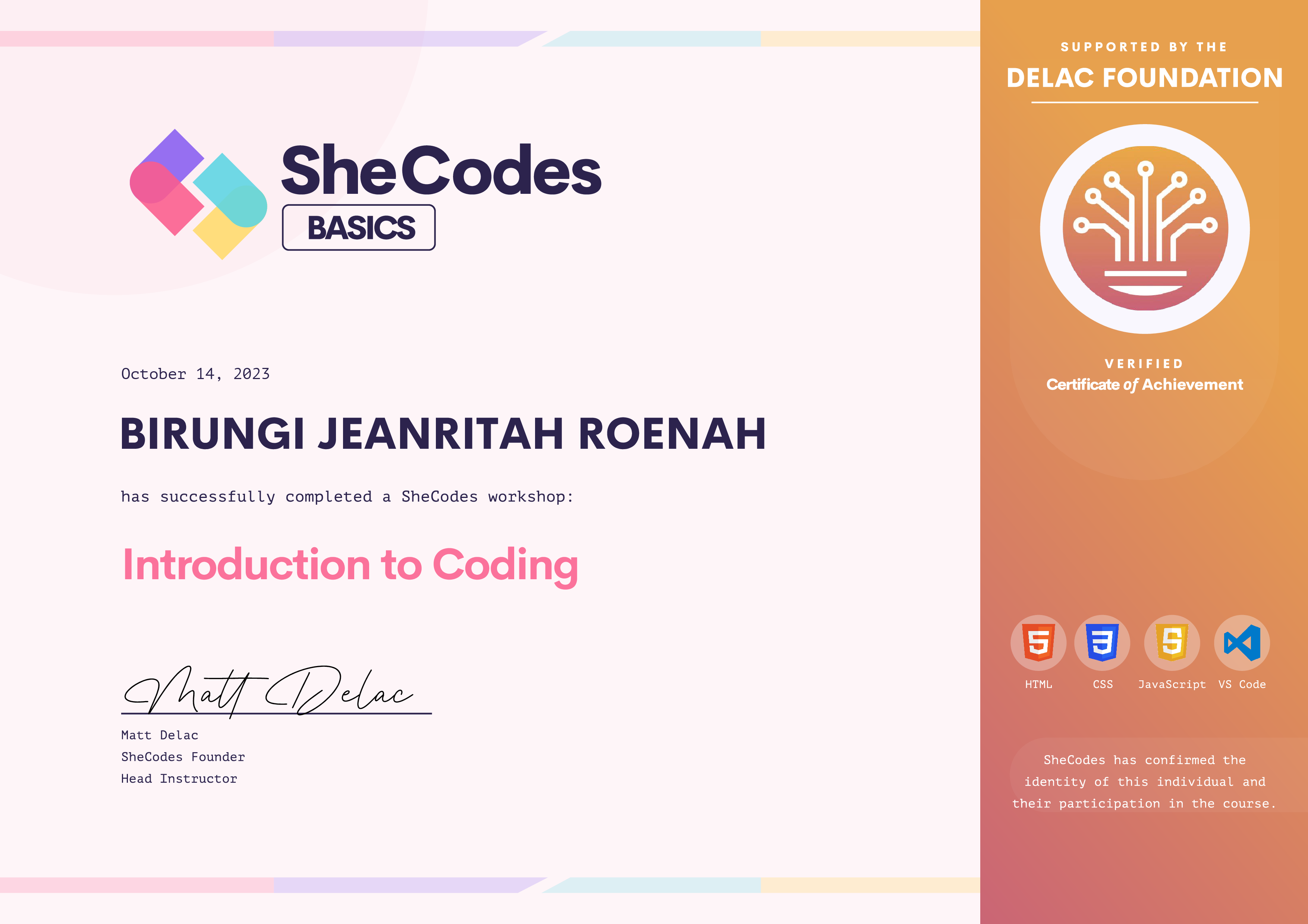 BIRUNGI has been fully supported by the Delac Foundation to complete this SheCodes Workshop