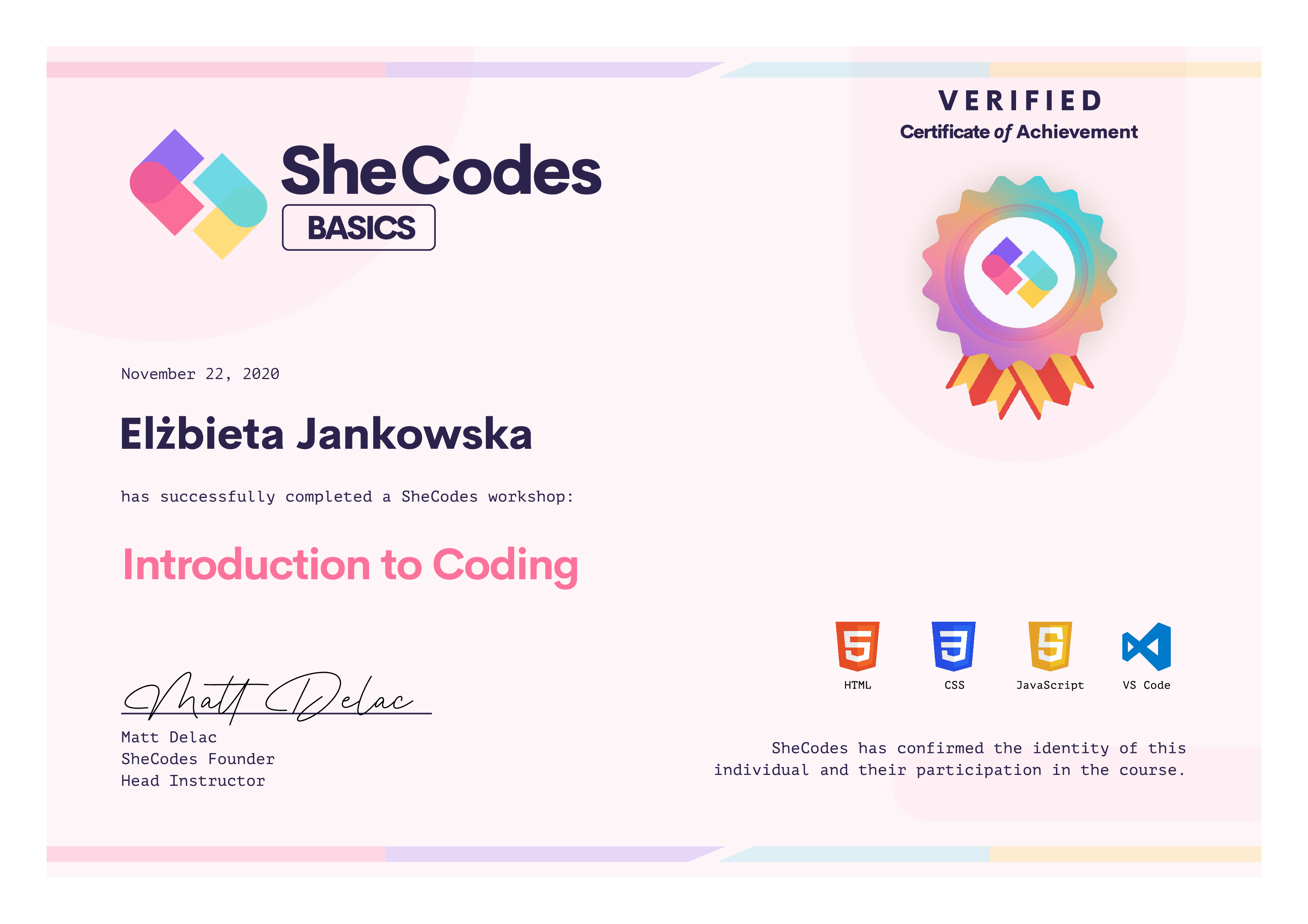 Elżbieta successfully graduated from at least one SheCodes Coding Workshop and is featured in the SheCodes Hall of Fame