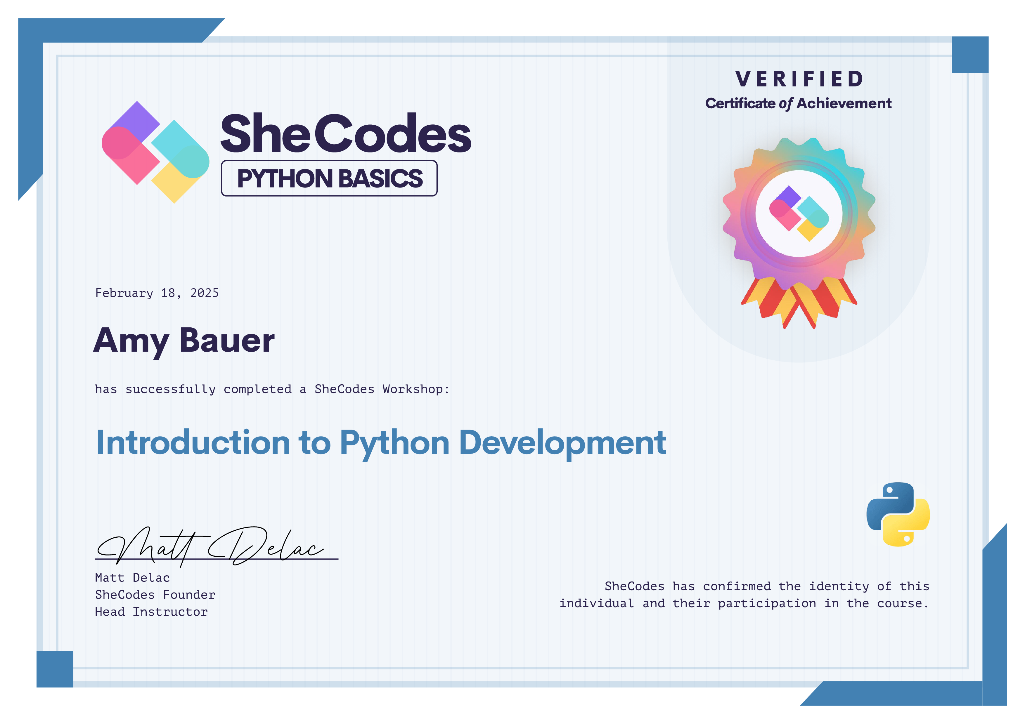 Amy successfully graduated from at least one SheCodes Coding Workshop and is featured in the SheCodes Hall of Fame