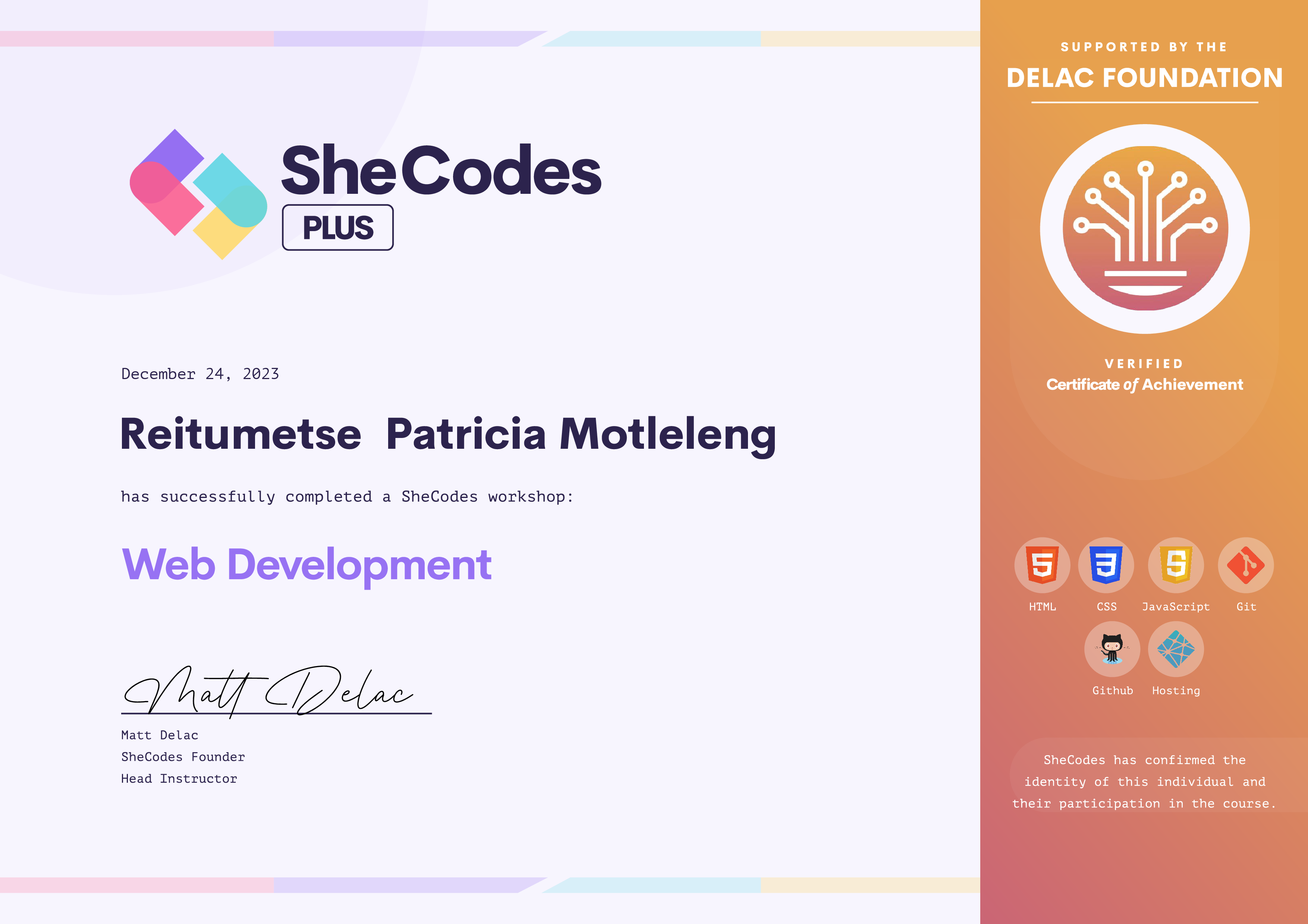 Reitumetse Patricia Motleleng SheCodes Profile | SheCodes