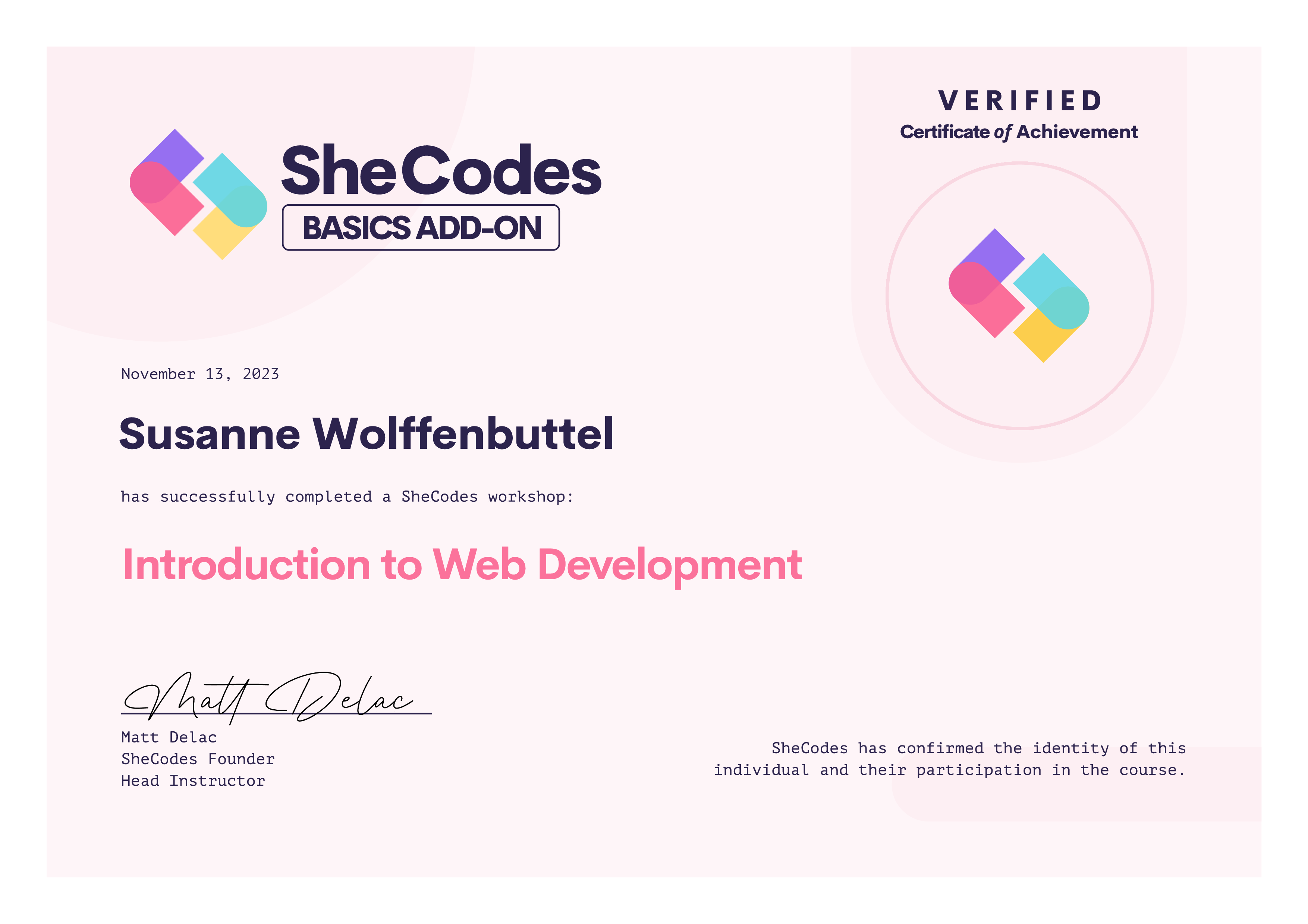 Susanne successfully graduated from at least one SheCodes Coding Workshop and is featured in the SheCodes Hall of Fame