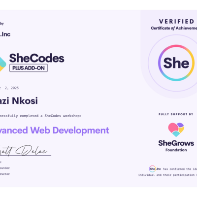 SheCodes has truly changed my journey into tech. Before joining, coding felt difficult and confusing, but the structured lessons made everything understandable and enjoyable. Every project helped me grow more confident and motivated. This certificate from SheCodes is a big achievement for me, and it has inspired me to keep learning and build my future in technology.