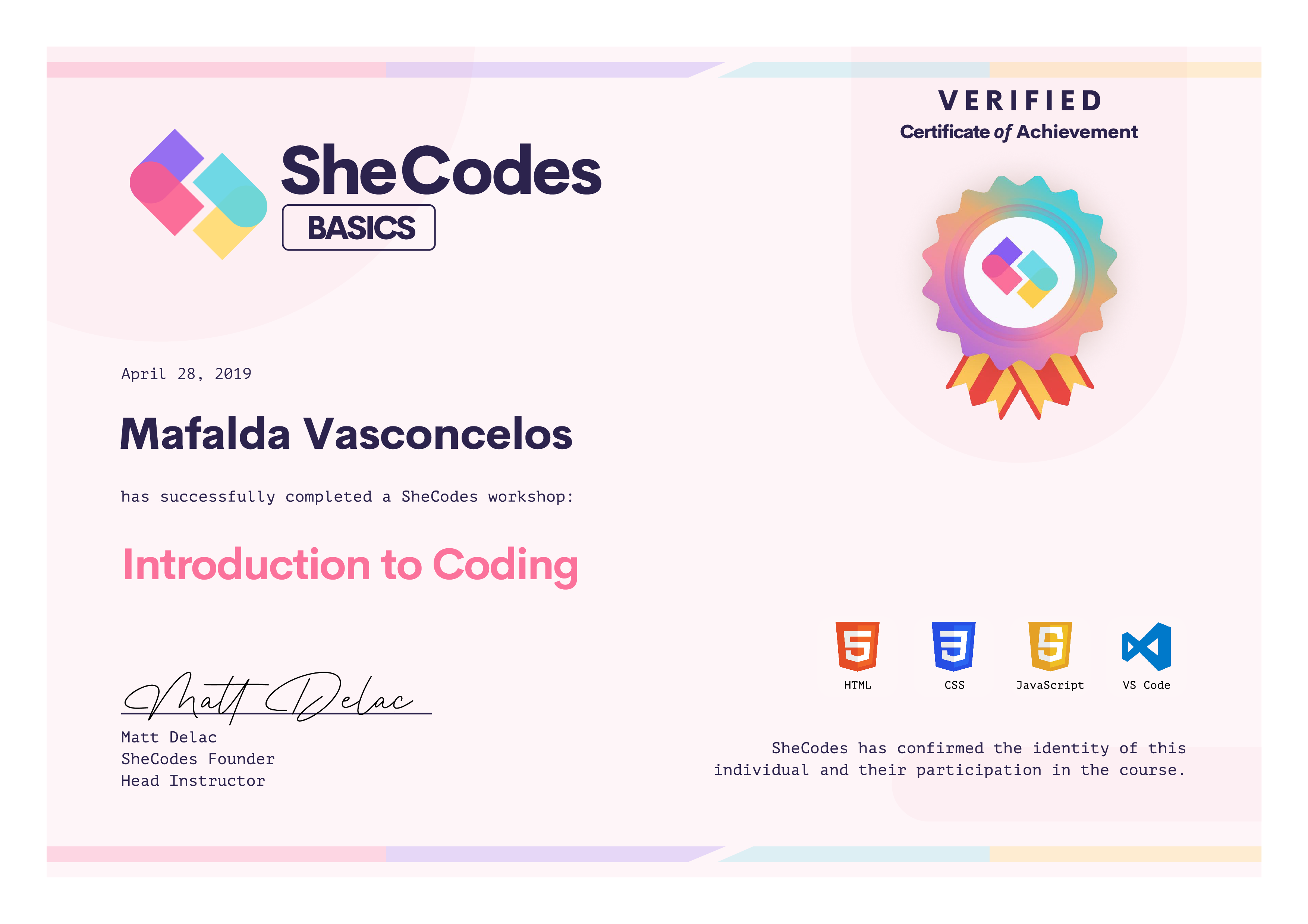 β€œIt was an amazing experience. I highly recommend SheCodes to begin a journey in Coding! We had the chance to learn HTML, CSS and JAVAScript, all valuable tools for the future.”