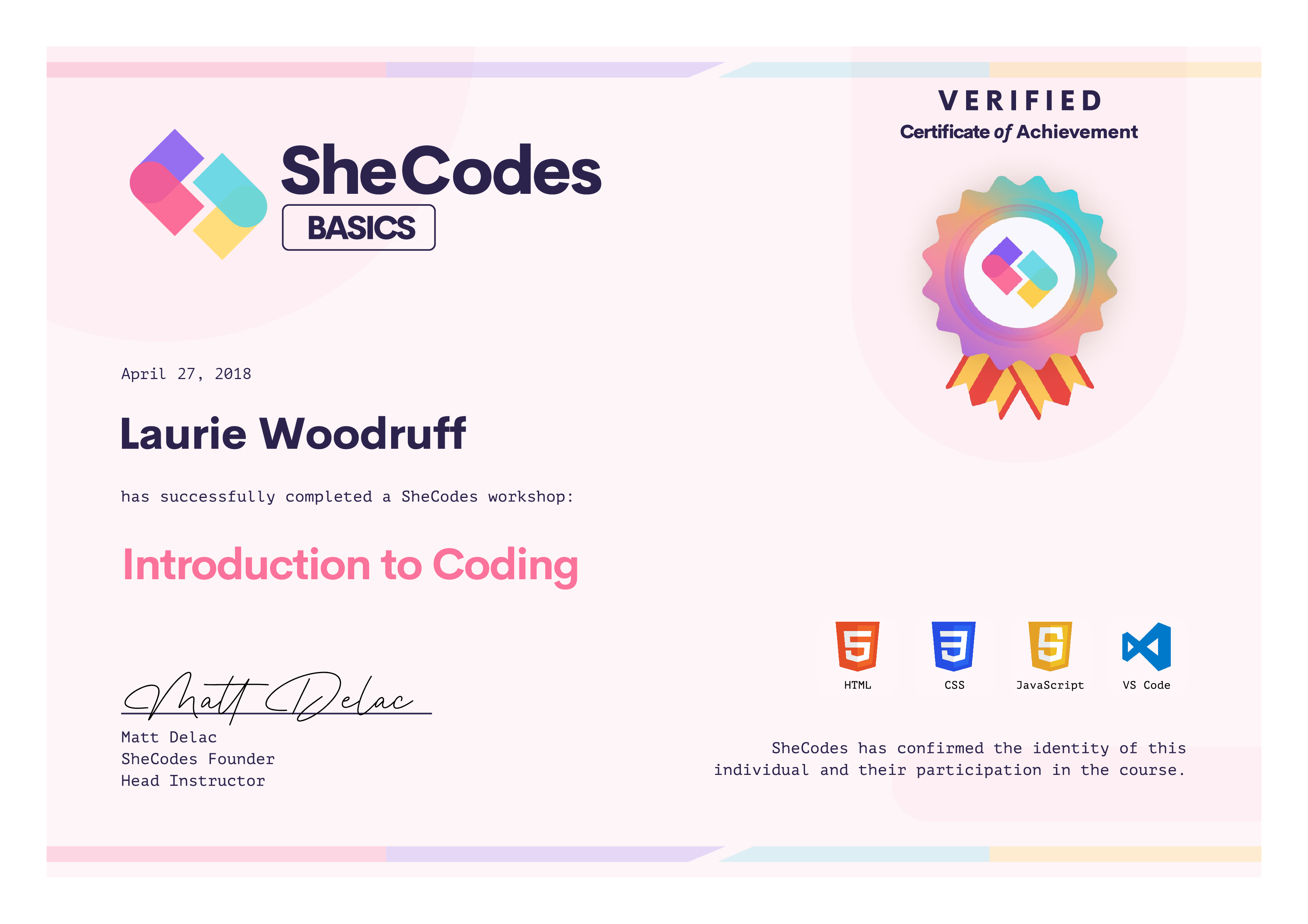 Successfully graduated from SheCodes Basics and is featured in the SheCodes Hall of Fame
